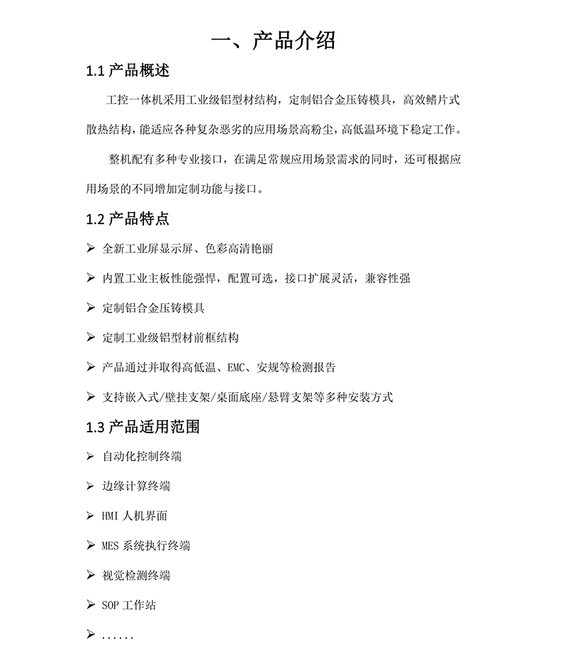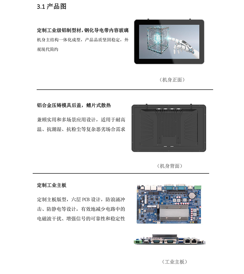 工控一体机采用全铝材质,定制独家压铸模具,高效的鳍片式散热结构, 能适应各种复杂恶劣的应用场景高粉尘,高低温环境下稳定工作。 整机配有多种专业接口,在满足常规应用场景需求的同时,还可根据应 用场景的不同增加定制功能与接口。