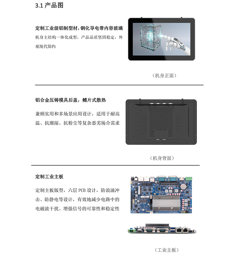 工控一体机采用全铝材质,定制独家压铸模具,高效的鳍片式散热结构, 能适应各种复杂恶劣的应用场景高粉尘,高低温环境下稳定工作。 整机配有多种专业接口,在满足常规应用场景需求的同时,还可根据应 用场景的不同增加定制功能与接口。