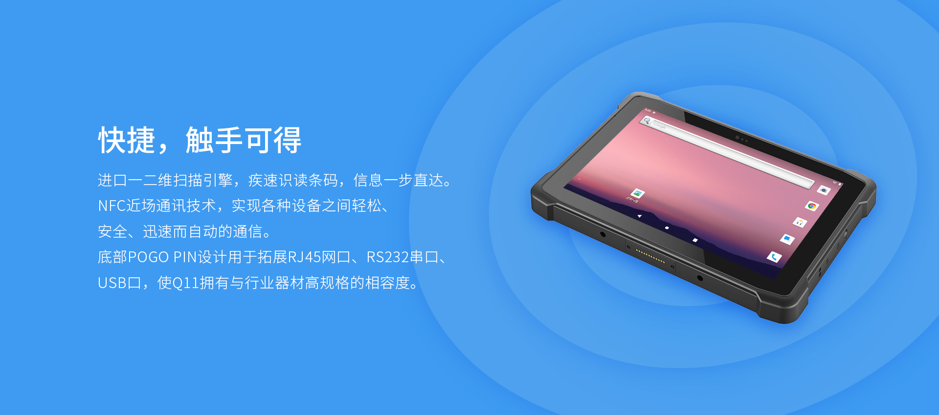 Q10PLUS 是一款10.1英寸加固平板电脑,采用ARM八核架构处理器 搭载Android 10操作系统,能带来更快、更高效的使用体验。其外观延续了上一 代机型的工业设计风格和强固式技术,保持了IP65防护的超高水准,另外还配备有 高清高亮屏幕、13MP后置摄像头、二维码模块(选配)、双频WiFi、双模定位、 大容量电池等功能特性,能应用在工业、制造业、公用事业等诸多行业场景。